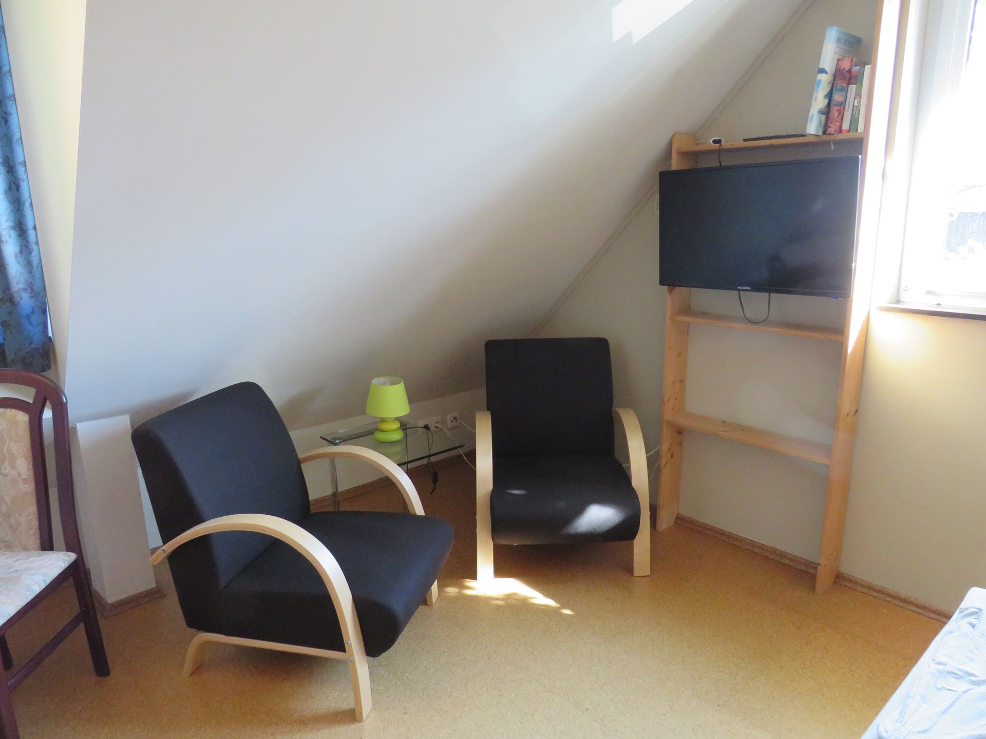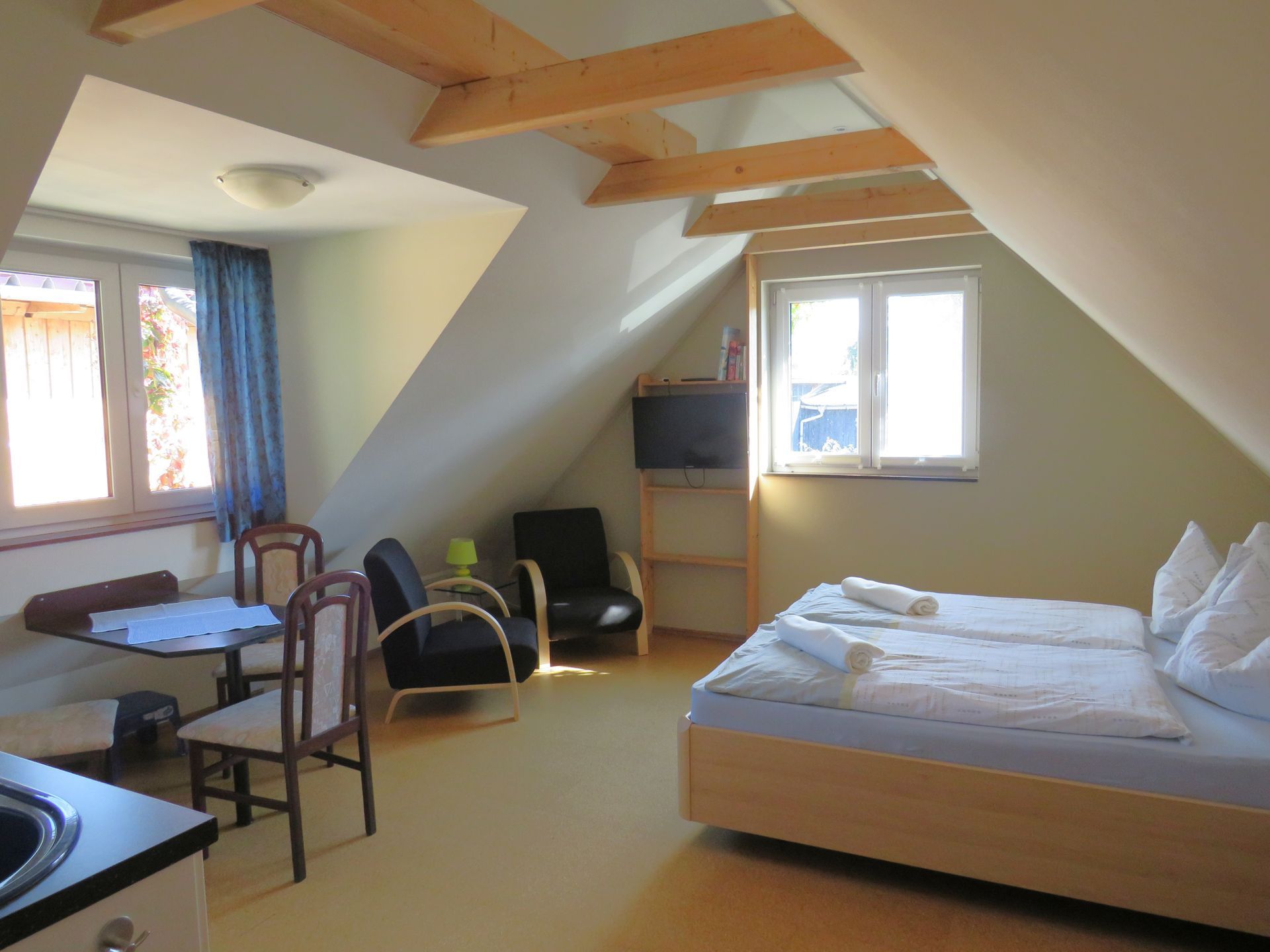 Die Ferienwohnung "Elster" bietet ebenfalls ein gemütliches Doppelbett, zwei komfortable Sessel, Sat-TV sowie eine gut ausgestattete Küchenzeile mit Herd und Backofen. Der Essbereich ist ideal für gemeinsame Mahlzeiten.